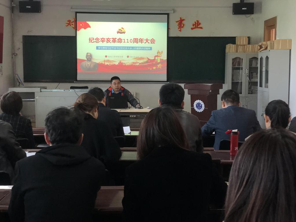 组织全体教师进行政治理论学习,认真学习贯彻习近平总书记在纪念辛亥革命110周年大会上的重要讲话精神,学习会由党委书记李奇涵主持。