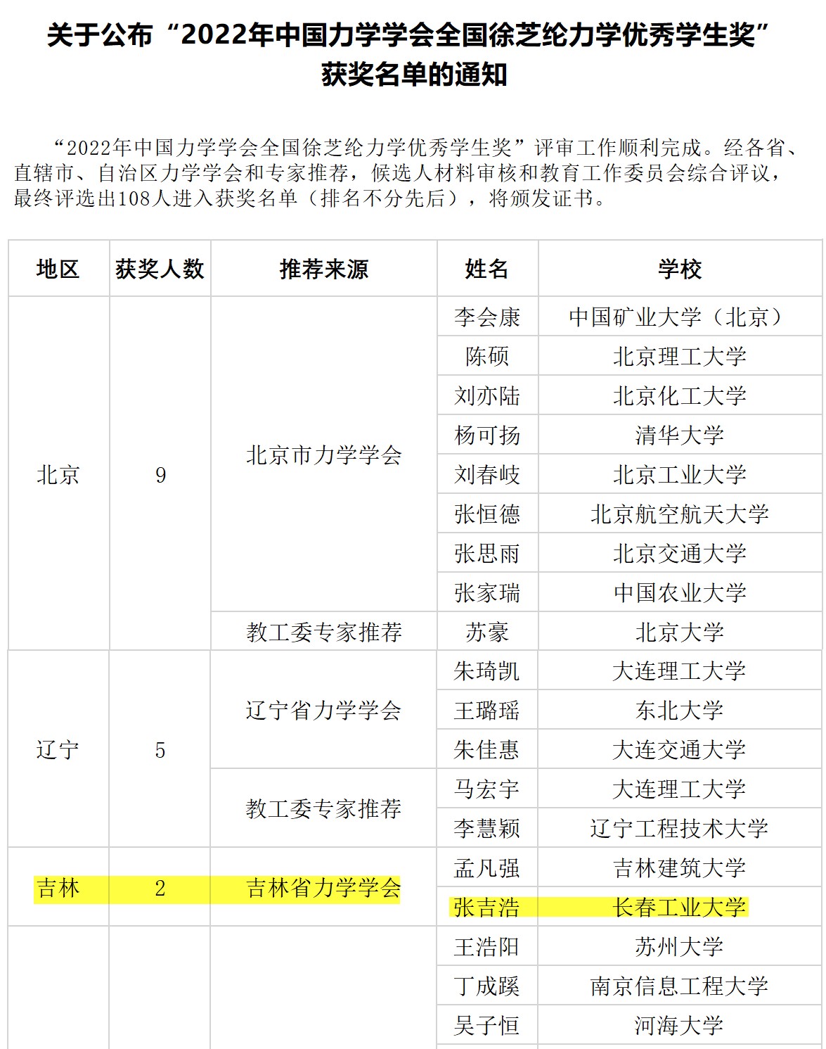 本网讯(通讯员:曹丽娜)中国力学学会官网公布了“2022年中国力学学会全国徐芝纶力学优秀学生奖”获奖名单,我院机械电子工程专业2019级张吉浩同学获此殊荣。本次全国各高校共有108人获此荣誉,吉林省仅有2人。
