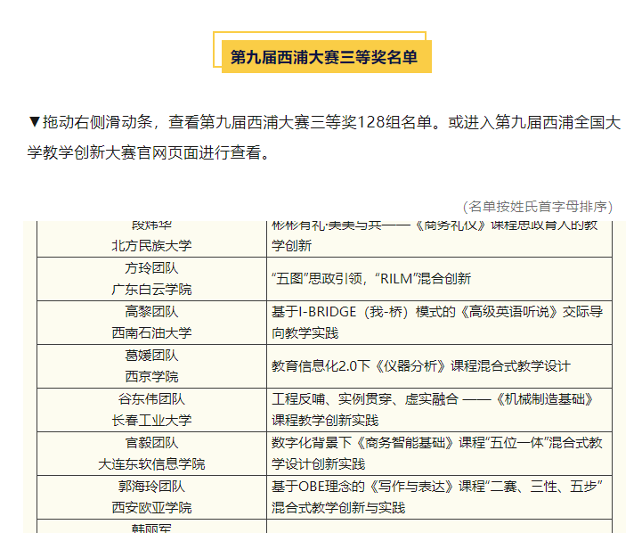等涵盖985/211、双一流、地方院校、民办高校等多元化属性的266所院校的1309组,共3898名高校教师及团队的参与。历时4个月经资料初审、大众评审、专家函评等严格赛程,评审出第九届西浦全国大学教学创新大赛决赛入围名单(50组)、年度教学创新三等奖(128组)、优秀奖(535组)和参与奖(178组)。