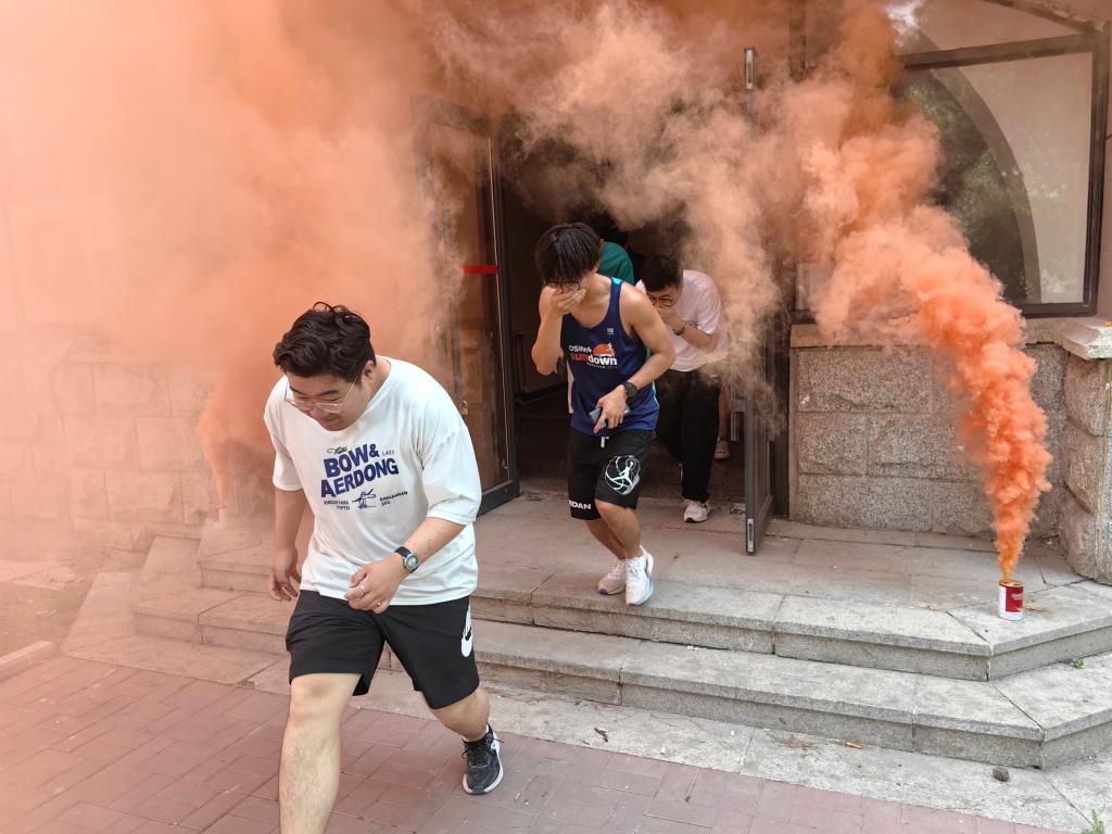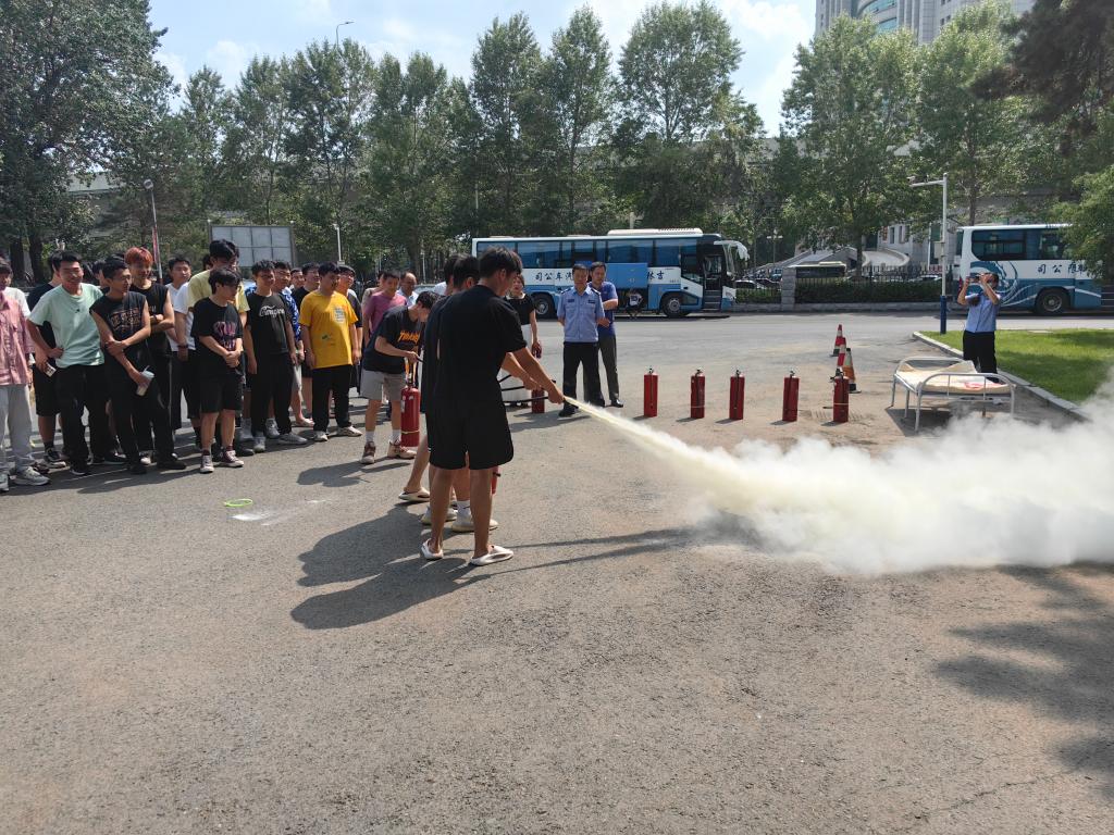 师生进行了消防安全知识培训。接着在安全处工作人员的示范指导下,在主楼机电侧开展疏散逃生、初起火灾扑救等科目的消防演练活动。14时许,随着现场指挥员“演练开始”口令,教学主楼西侧突发火情,在教师安全引导员的指引下,师生从楼内快速有序地疏散到安全区域。