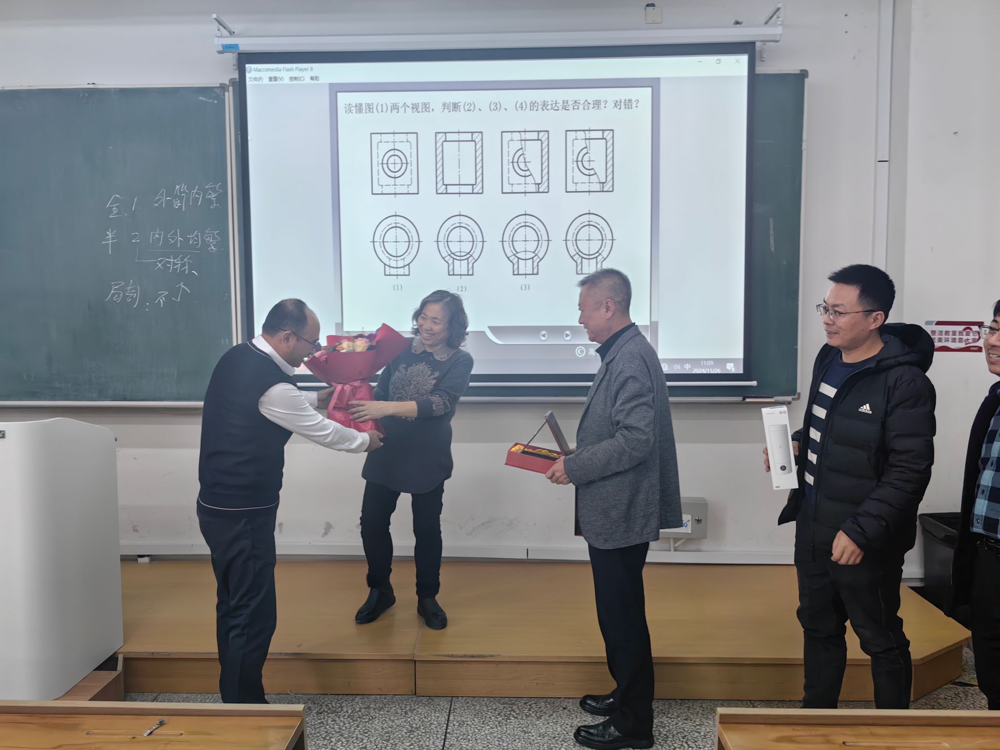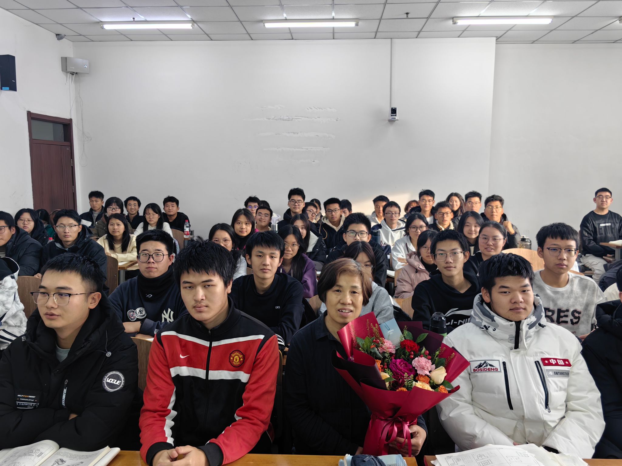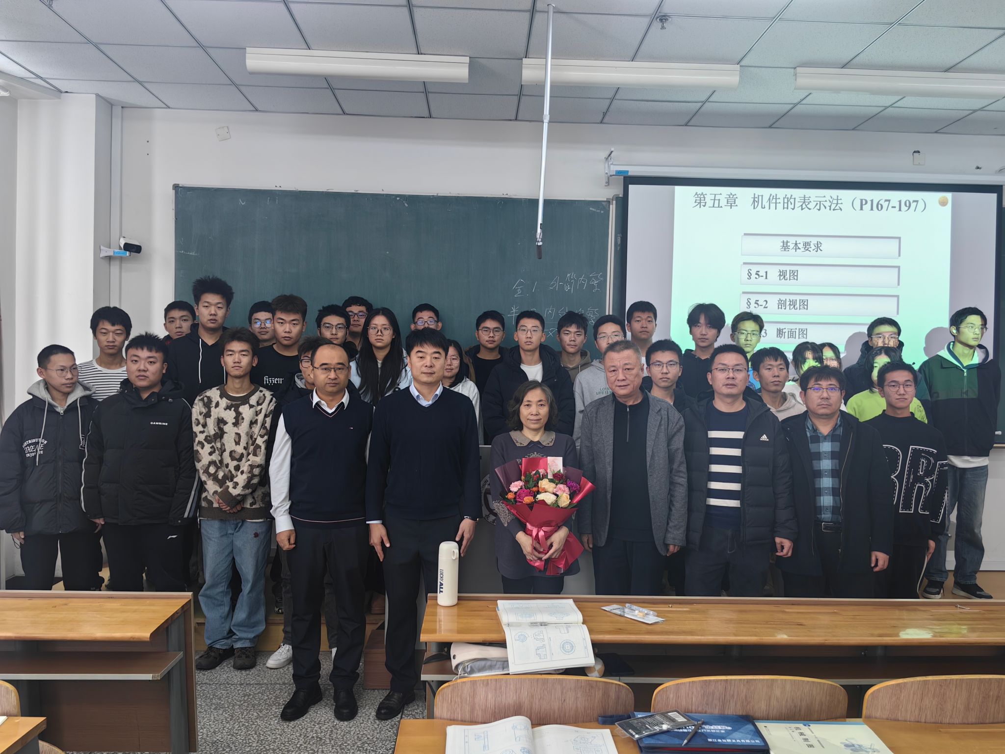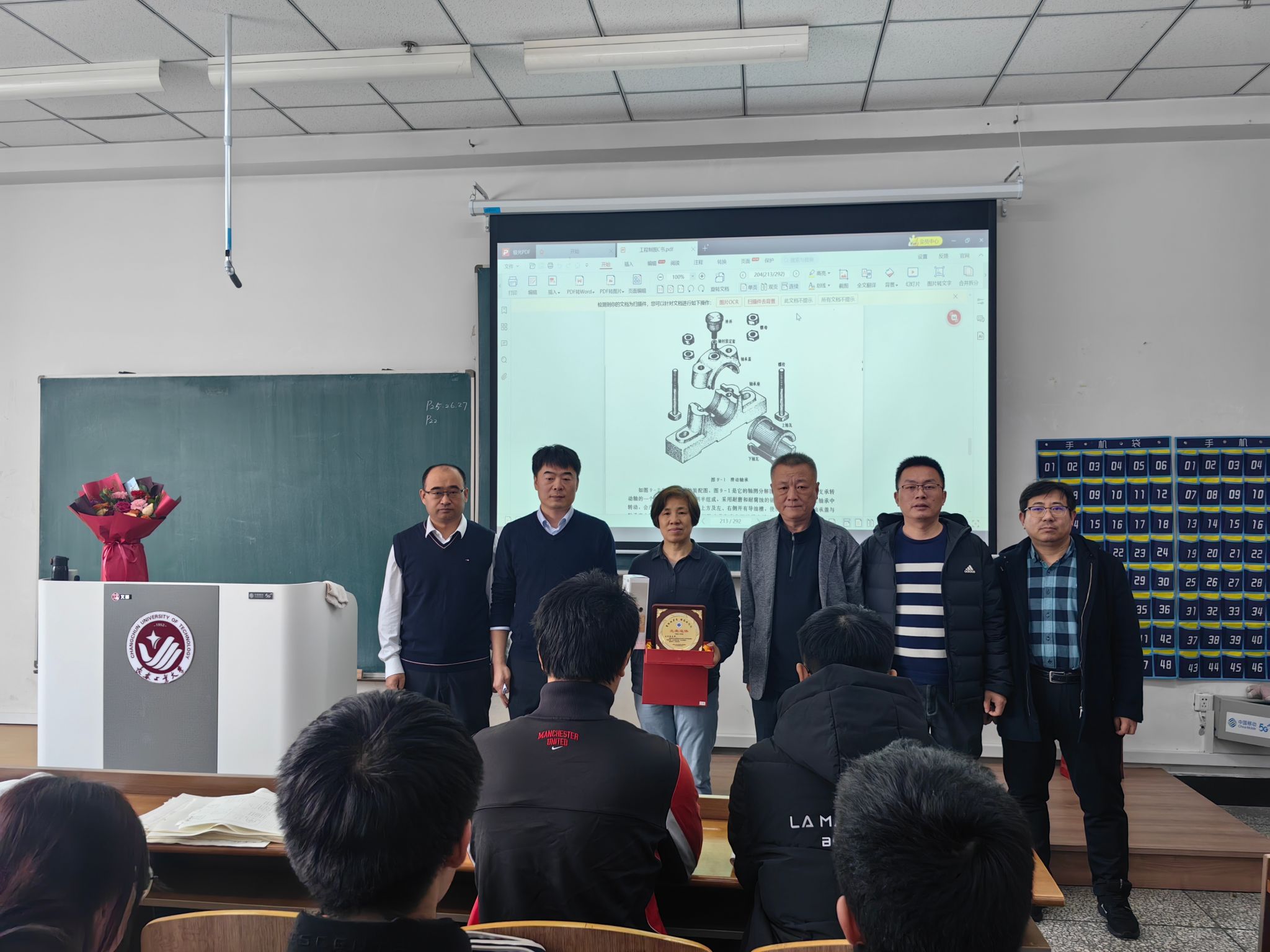 党委书记张利军、院长郝兆朋、副院长谷东伟、副院长卢明明、机械基础教学中心主任刘小勇一起来到课堂,与全体上课学生共同见证了这一光荣时刻并送上美好祝愿。