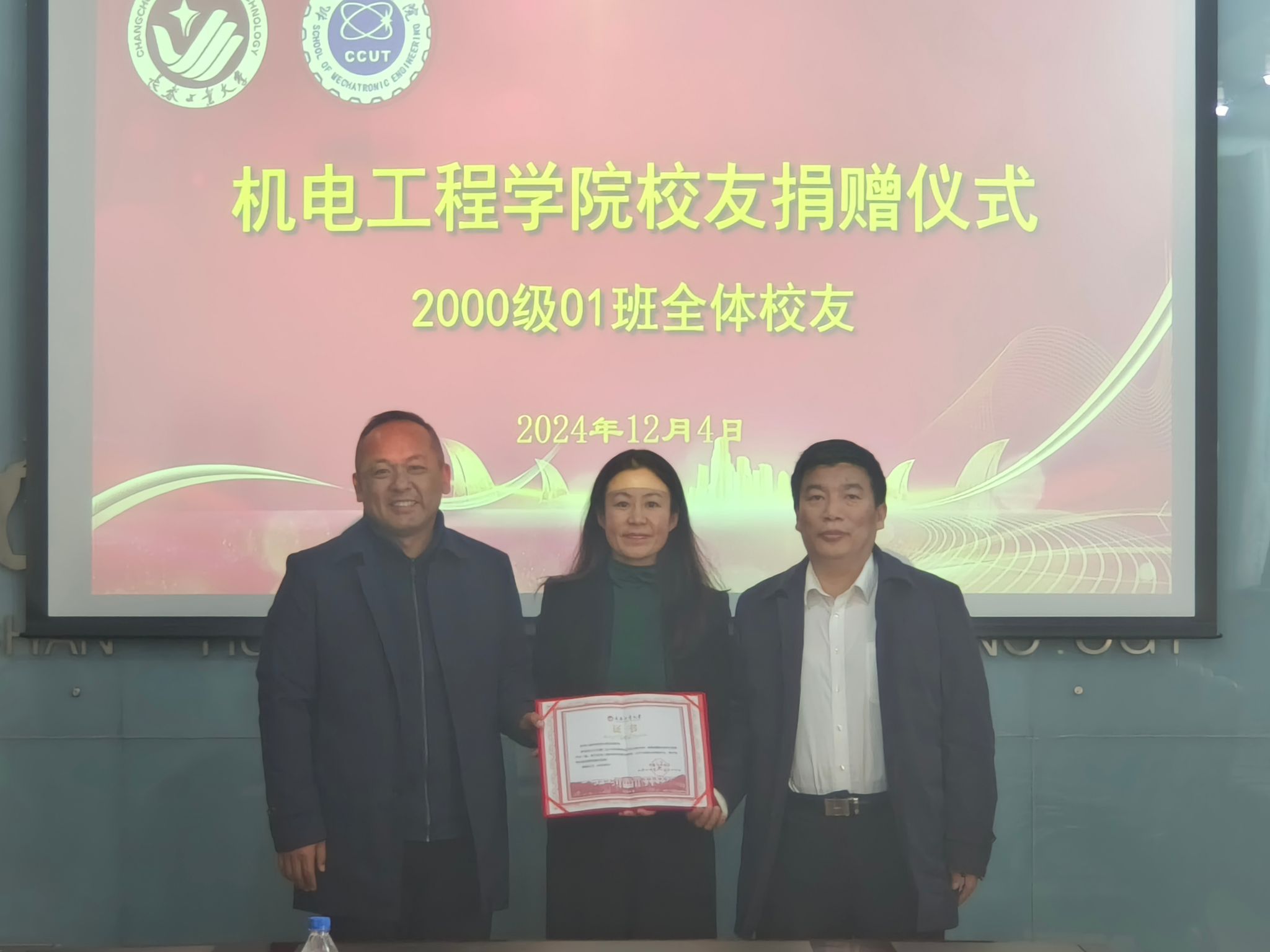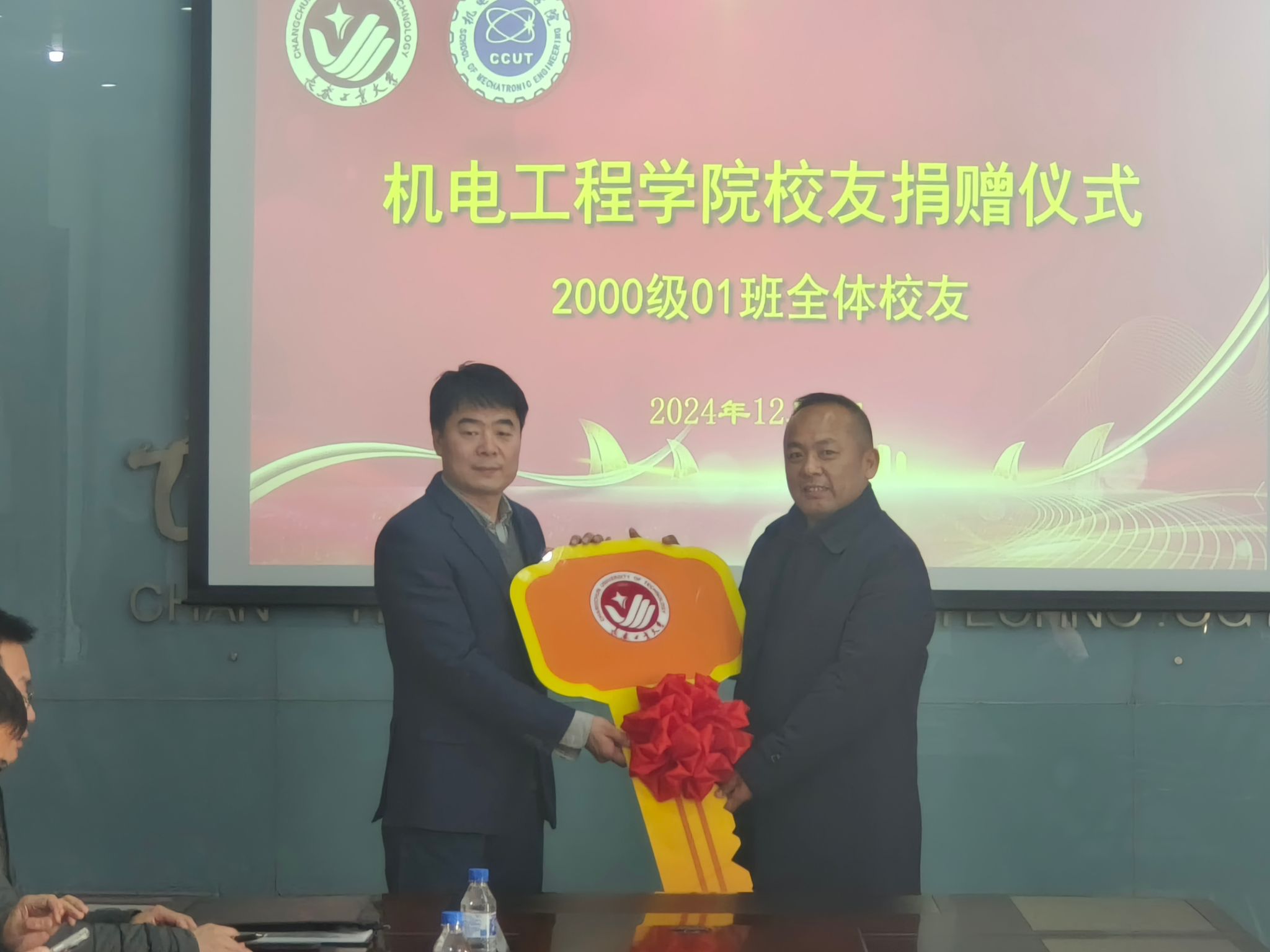 赠送汽车钥匙模型,李东玲代表长春工业大学向校友赠送捐赠证书。