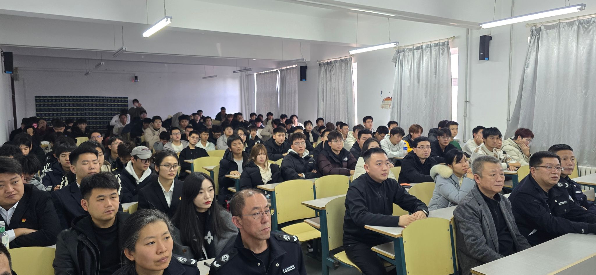 在讲座环节,齐继东科长以“场景化+实操性”为导向、围绕防火安全知识及消防设施使用方法进行了讲解,他强调校园消防安全直接关系师生生命安全,全体师生应筑牢底线思维。活动尾声,全体人员集中观看消防安全警示宣传片,短片还原了多起校园火灾全过程,深入剖析了火灾的形成原因和火灾扑救、浓烟逃生等关键场景,让师生深刻认识到火灾带来的危害和消防安全教育的重要性。