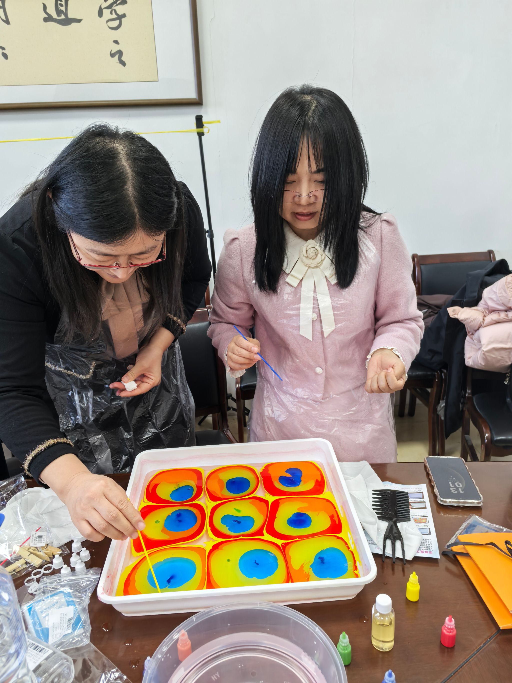 在了解了基本技法后,大家纷纷化身“水中艺术家”,跃跃欲试。她们小心翼翼地在水面上滴洒着五彩斑斓的颜料,用小棒或画梳轻轻拨动、勾勒,水面瞬间幻化出或如流云、或如涟漪、或如山水的抽象图案。当洁白的丝巾平缓地覆盖水面,吸附住那绚丽的色彩与纹理后,再缓缓提起,一幅幅独一无二、充满想象力的水拓丝巾作品便跃然眼前。看着自己亲手制作的丝巾,从素白到绚烂,老师们的脸上洋溢着惊喜与满足的笑容,现场气氛温馨而热烈。