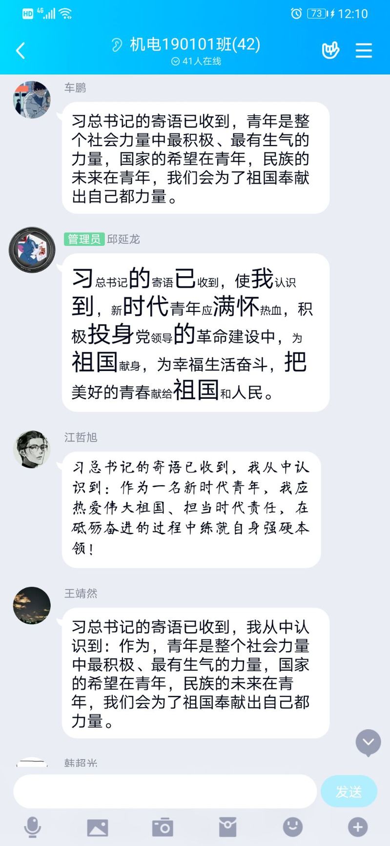 全院团支部将学习习近平总书记对新时代青年寄语精神纳入“青年大学习”行动全年计划,根据疫情防控形势,开展线上集体学习、分享交流等活动,各位团员积极发表自己的感悟:习近平总书记的寄语饱含殷切期望,给新时代的青年带来了巨大的信心和希望,给青年人指明方向,为青年人鼓足干劲。作为中国新青年的我们,在仰望星辰的同时亦脚踏实地。用实际行动去证明,中国青年是好样的。在时代的洪流中,不忘初心,牢记使命,响应时代召唤,为民族团结,国家安定,人民幸福的中华民族伟大复兴的共同理想作出不懈努力。