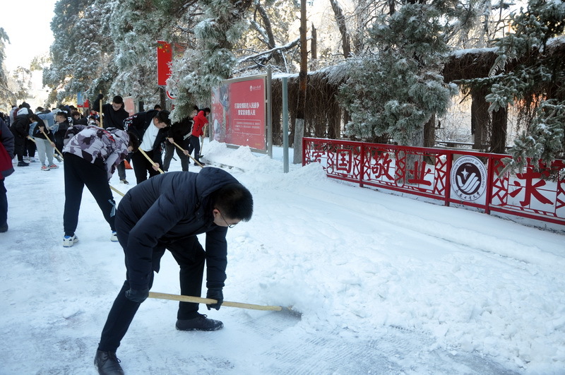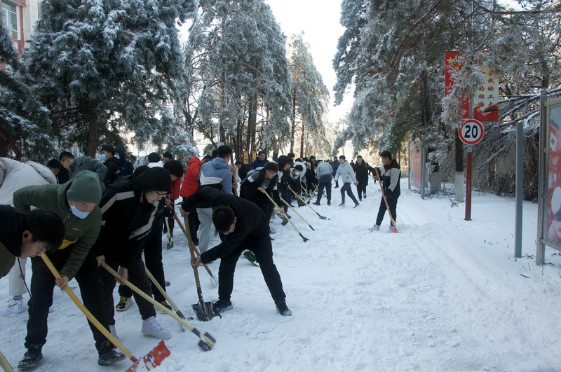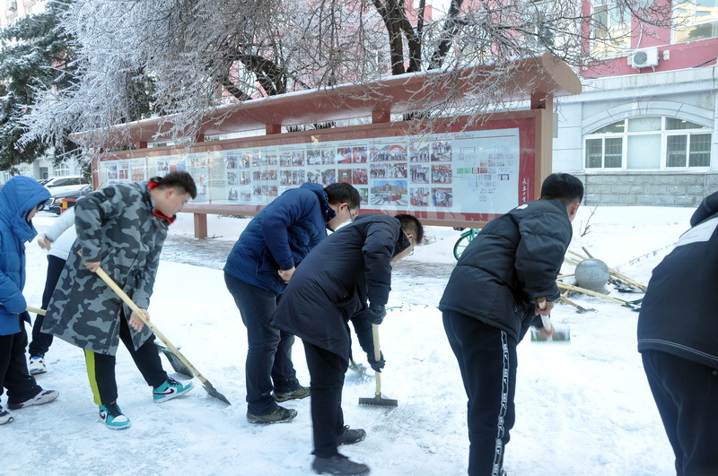 领导和老师的带领下,无惧严寒,热情高涨,齐心协力,整个活动场地喧嚣又忙碌。经过一个多小时的努力,主楼前后两条道路的部分积雪得到了清理。