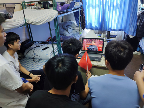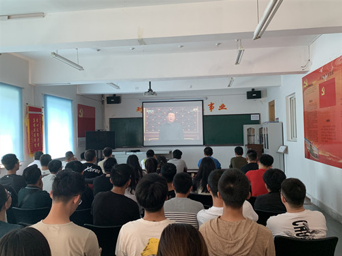 上午9时,同学们以饱满昂扬的态度来到会议室一起来观看此次国庆大阅兵。上午10时,56发礼炮,齐放70响,随后中华人民共和国国家主席习近平总书记发表重要讲话:伟大的中华人民共和国万岁!伟大的中国共产党万岁!伟大的中国人民万岁!阅兵式正式开始。