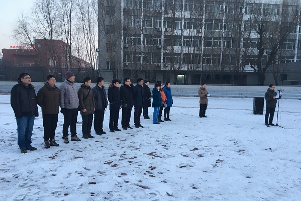 学生会主席王翔作为学生代表宣读了“纪念一二九,立我报国之志”的倡议书。升旗仪式上,全国百炼之星李远东、校十佳自立自强大学生孟祥波、校社团联合会主席付嵩翔、院十佳优秀大学生古力加依娜.米兰组成的护旗方队首先入场,工作人员介绍了护旗手的成长事迹。两名国防生升旗手振臂一挥,全场1000余名师生一同高唱国歌,鲜艳的五星红旗在初升的阳光映照下冉冉升起,气氛隆重而热烈。