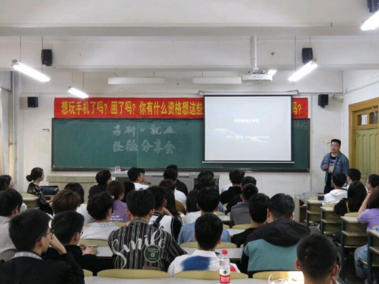 会上,宋长昊学长结合自身实际,和大家分享了自己的考研复习经历与心路历程,他从考研的各门课程入手,逐一分析每门课程的学习方法与复习策略,并告诉同学们在大一到大四应该怎样规划自己的学习时间,勤勉刻苦,专心学习。