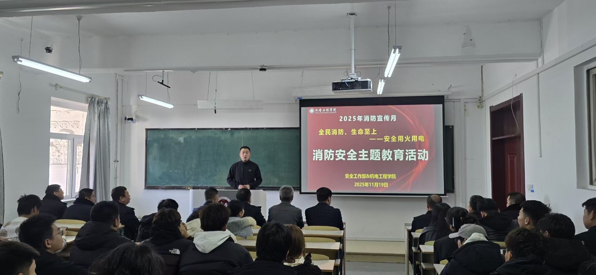在讲座环节,齐继东科长以“场景化+实操性”为导向、围绕防火安全知识及消防设施使用方法进行了讲解,他强调校园消防安全直接关系师生生命安全,全体师生应筑牢底线思维。活动尾声,全体人员集中观看消防安全警示宣传片,短片还原了多起校园火灾全过程,深入剖析了火灾的形成原因和火灾扑救、浓烟逃生等关键场景,让师生深刻认识到火灾带来的危害和消防安全教育的重要性。